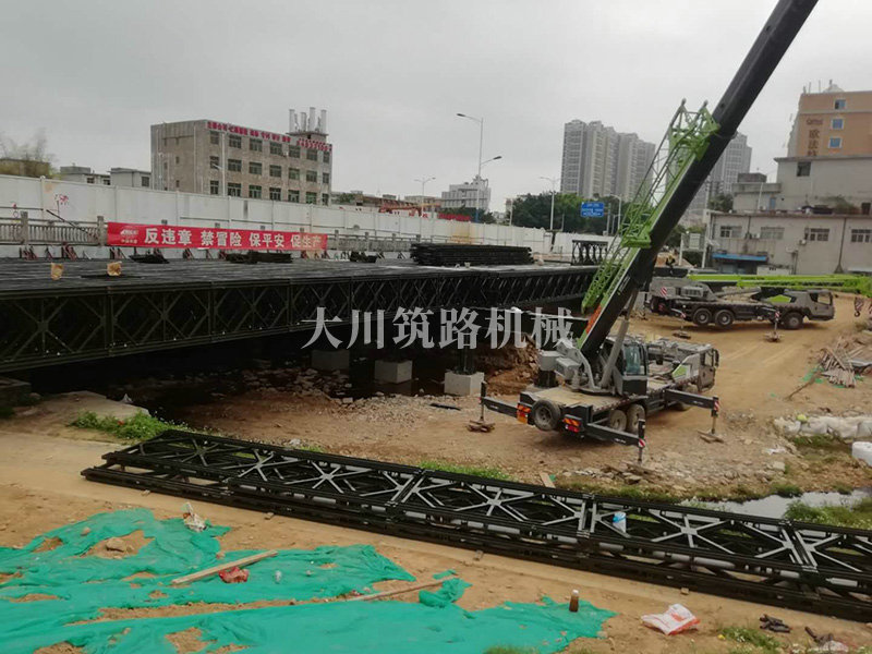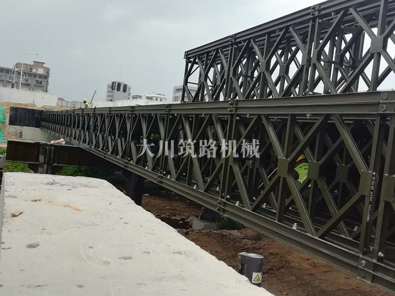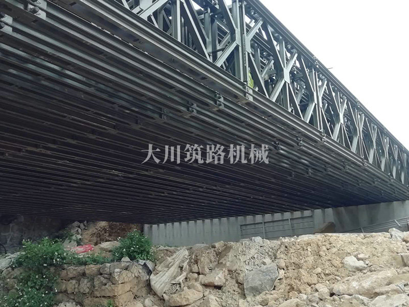鋼橋型號:48m*16m加強(qiáng)型6(車道)+2(人行通道)+防撞護(hù)欄,上承式鋼橋,橫向布置35排貝雷梁,分兩跨,橋墩為單排四柱式φ800鋼管樁,上表鋪混泥土。